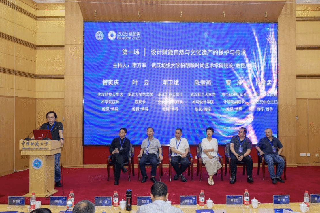 圆桌论坛环节,两场深度讨论引发行业思辨。首场论坛以“设计赋能自然与文化遗产的保护与传承”为主题,由武汉纺织大学伯明翰时尚学院院长李万军教授主持,与会者围绕“设计如何破解文化遗产保护难题”“社区参与式保护模式”等议题展开交流,湖北大学艺术学院院长叶云教授、湖北工业大学工业设计学院院长邓卫斌教授、武汉科技大学艺术设计学院院长管家庆教授、华中科技大学设计学院副院长曹淮教授、武汉轻工大学艺术与设计学院院长陈莹燕教授、湖北美术学院色彩研究中心主任肖世孟教授参与首场论坛。第二场论坛聚焦“AI时代的高校美育与设计教育”,由湖北美术学院长江动画研究中心主任叶佑天教授主持,探讨了“AI工具的合理应用”“人机协作模式”等议题,武汉大学城市设计学院副院长黄敏教授、中南民族大学美术学院副院长成彪教授、湖北第二师范学院艺术学院院长金波、湖北经济学院艺术设计学院院长顾琛、武汉禾田教育集团董事长杨俊俏参与第二场圆桌论坛。