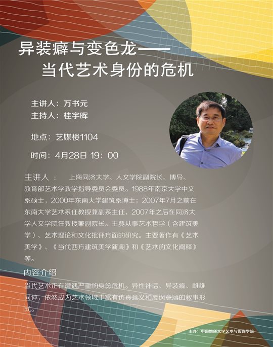 (通讯员:陈康 拍摄:毕鸿辉)2017年4月28日晚19点,教育部艺术学教学指导委员会组员,同济大学人文学院副院长万书元教授做客威廉williamhill1301室,作了题为《异装癖与变色龙——当代艺术身份的危机》的专题讲座。桂宇晖院长主持了此次讲座,武汉大学杨雪松教授、武汉理工大学雷鑫博士等参加了此次讲座。