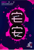 作品以红黑为主色调,新冠病毒元素为创作背景,以宅与安两字字形的一笔之差,将两种概念结合互通。国难当头,国民皆响应号召过起了长达一个月的宅生活,在不习惯的状态下,殊不知宅即安。希望海报达到能呼吁大家少出门,勤洗手,少去人群聚集地,听党指挥做好防控的目的。