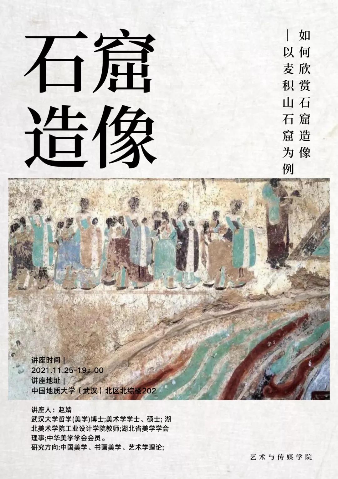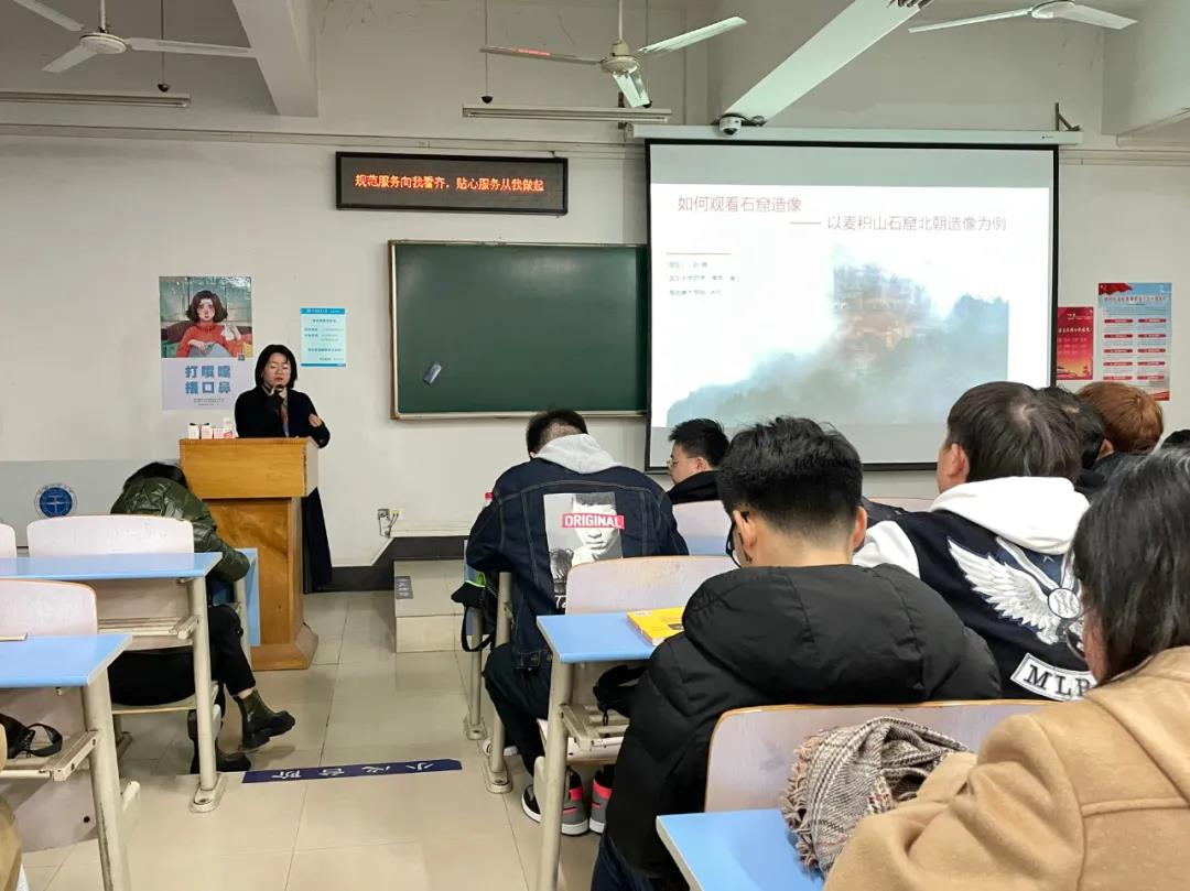 为增强我院学生传统工艺美术的美学欣赏能力,扩宽学生学术知识维度,william威廉中文艺术传媒学院于11月25日19时于东校区综合楼201室举办了“如何欣赏石窟造像——以麦积山石窟为例”主题讲座。讲座邀请了武汉大学哲学(美学)博士、湖北美术学院工业设计学院赵婧老师为大家讲授这堂精彩纷呈的艺术欣赏课。课堂上,赵老师结合自身研究领域,详细为大家讲解了如何欣赏石窟造像,开阔了同学们的眼界,也为同学们补充了石窟雕塑相关的专业知识。讲座通过口述、图片等方式展示,生动具体,吸引了大家的兴趣和关注。