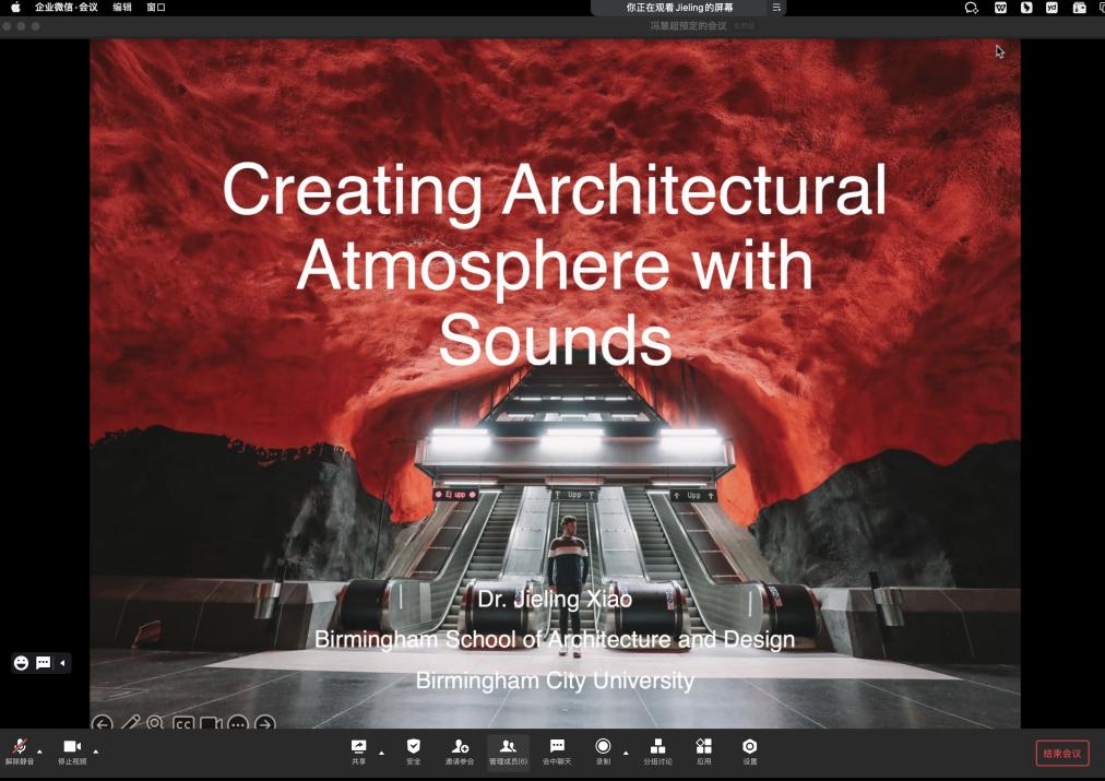 第一部分,肖捷菱教授从理论层面讲解声压级和声音频谱对人舒适度的影响,通过列举音乐厅对声音的反射和吸收引入不同材料对声音反射和吸收的差异,提到回声和混响的概念,讲解声音景观的概念;接着通过互动观看视频的方式说明了不同材料和空间结合,声音听起来会不一样,带给人不同的感受;用音乐展亭(Musical pavilion, 2022)、声音与历史文化遗产结合(80Hz pavilion, 2018)、“海哨子”(Rumors from the sea, 2019)等一系列案例说明声音在艺术设计领域的应用,用独特的视角给人不一样的视听体验,诠释了声音的功能性、启发性和作为情感性的纽带的特点。