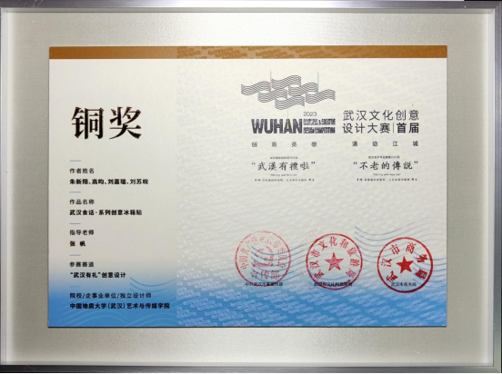 该大赛征集活动引发了文创设计专业人士、文创企业和机构、院校师生等社会各界人士的广泛关注,共收到来自全国27个省市(自治区)1948位注册用户的1556套(3739件)创意设计作品,涵盖了IP设计、插画、文创产品、书籍装帧、老字号策划案、应用程序APP、环境艺术设计等七大类别。经过初评和终评,我院张帆副教授指导的2个研究生团队凭借独特的创意思路、精湛的设计手法以及出色的团队合作精神取得优异成绩。其中朱新翔、高昀、刘嘉瑞、刘苏皖完成的作品“武汉食话·系列创意冰箱贴”获得铜奖;江楠、杨倩瑜、苏恺琳、周缘完成的作品“四季美茶饮产品包装与衍生伴手礼设计”获得创意优秀奖。
