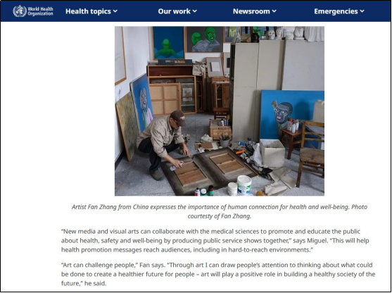 近日,世界卫生组织西太平洋区办事处(World Health Organization | Regional Office for the Western Pacific)官方网站在题为“Using art to inspire positive change for future health in the Western Pacific”的专题报道中刊发了我院张帆副教授的访谈及作品。2022年,张帆副教授作为唯一一位来自中国的艺术家参与了世卫组织西太平洋区办事处的艺术项目“WHO Futures Art Exhibition”,作为该艺术项目的组成部分,世卫组织西太平洋区办事处对张帆副教授进行了专访并于近日在专题报道中刊发了部分访谈内容。专访中张帆副教授与对方探讨了艺术家的创作;“COVID-19”对世界及人类社会的影响;如何改善解决生态环境问题;艺术对创建健康未来社会的作用以及疫情影响下艺术家个人生活状态等议题。张帆副教授的作品曾在多个国家展出并发表收录于多部国际艺术出版物,近年来欧洲多个国家的艺术杂志及网站也相继对张帆副教授进行了专访并全文刊发了访谈内容及部分作品。