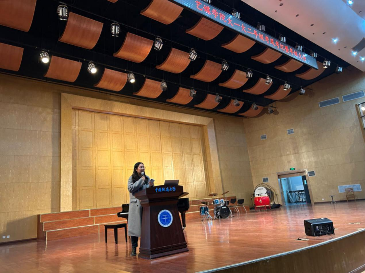 大会第三项,学工组辅导员曾戈晖首先介绍了2022级本科生的基本情况,其次对学风建设、安全教育、日常管理等问题做强调,最后从成果积累、未来规划、学生问题及应对方式入手进行了学期总结。