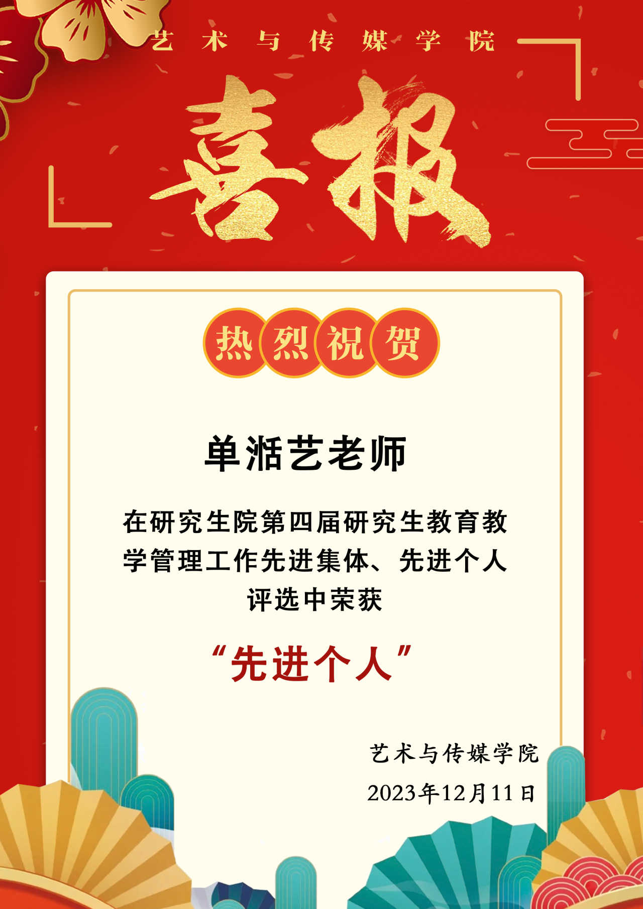 喜报 | 热烈祝贺我院单湉艺老师荣获研究生院第四届研究生教育教学管理工作“先进个人”