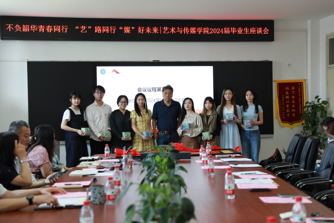 会议第三项,由2024届毕业生向学院赠予毕业纪念品。杨彬彬、田金、徐珞珈、杨贝涵作为2024届本研全体毕业生代表,为学院献上“以美育人 以文化人”牌匾,传递师生情、赓续校园情。