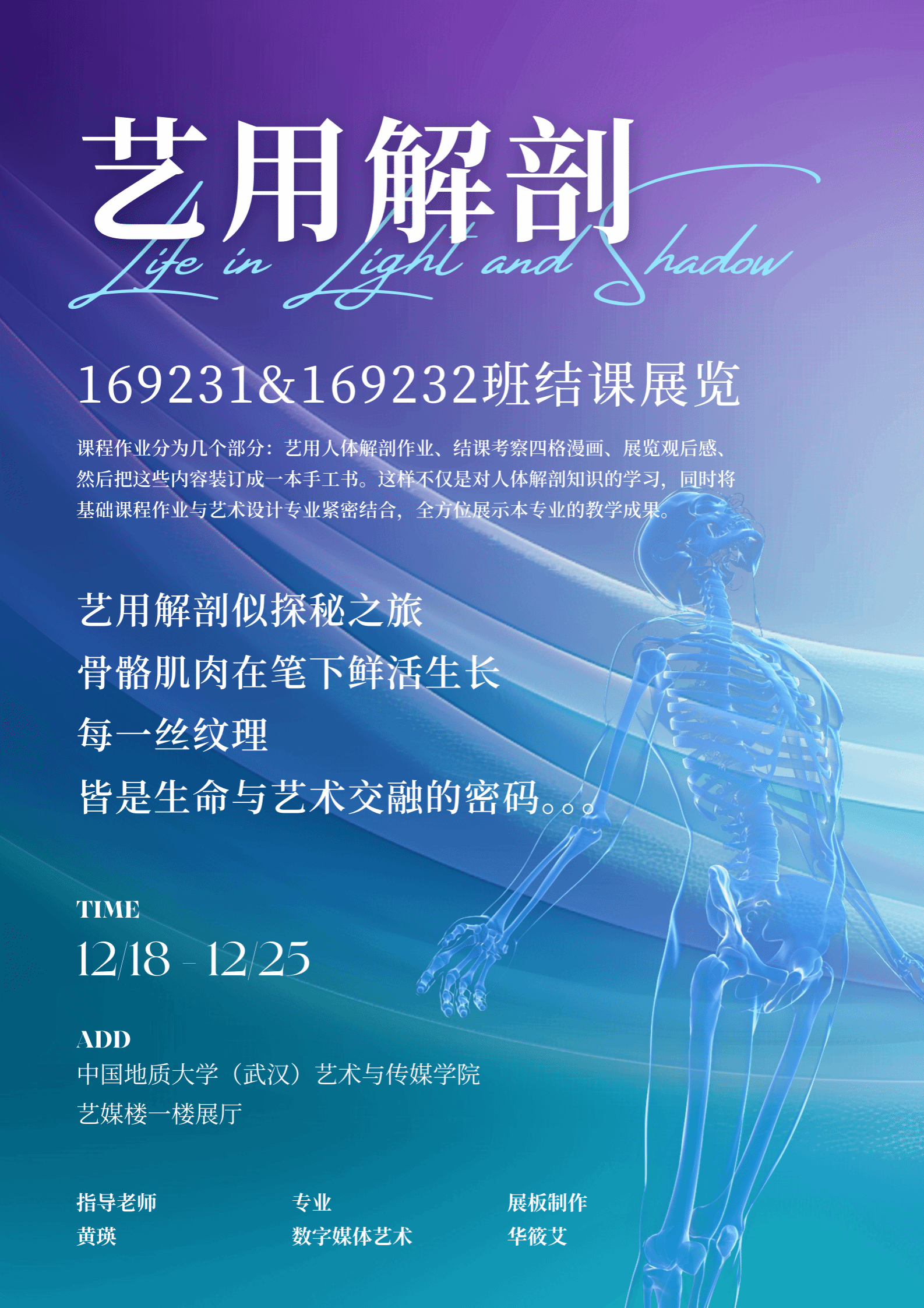 (通讯员:汤雨禾 周睿琪)2024年12月18日-2024年12月25日,在艺术与科学的交汇点上,威廉williamhill大楼一楼中厅,黄瑛老师指导数字媒体艺术专业169231&169232班的学生们以一场结课展览,展现了艺用解剖学的独特魅力。这场展览展示了学生们对人体解剖学的深刻理解,同时将艺术设计与课程作业紧密结合,以手工书的形式,多角度呈现了艺用解剖学的丰富内涵。