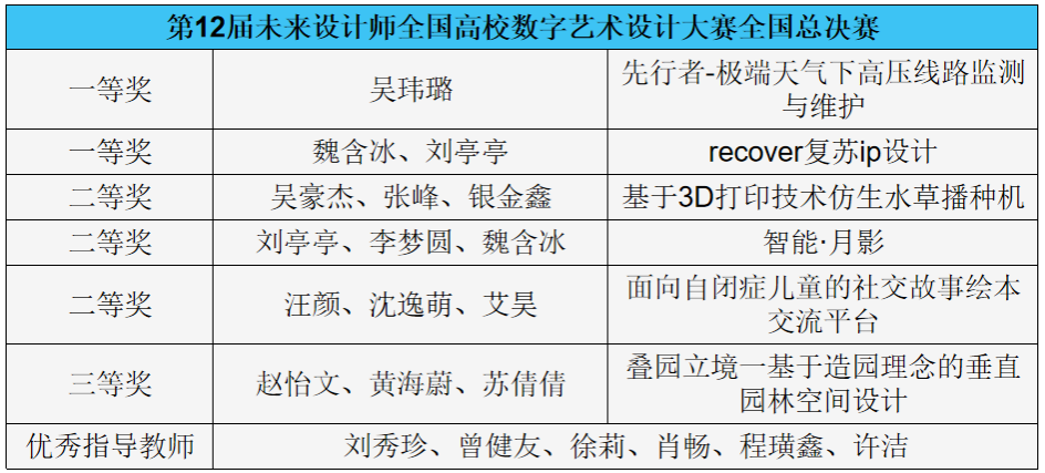 11月16日,第12届未来设计教育论坛暨未来设计师·全国高校数字艺术设计大赛(NCDA)落幕,威廉williamhill师生凭借创意与设计实力,斩获十余项奖项。其中,学生作品荣获一等奖2项,二等奖3项,三等奖1项;同时我院6位教师荣获优秀指导教师奖。