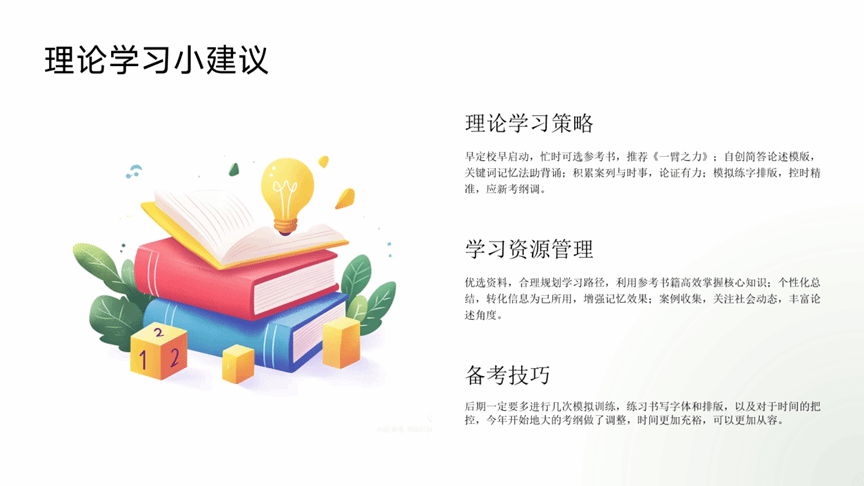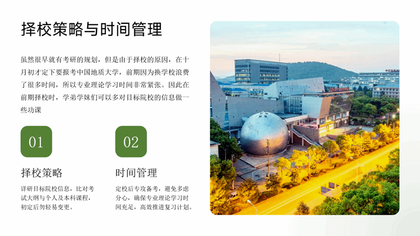 主讲人谌天一本科为广播电视学专业,考研初试专业课 256 分、排名第二,曾获 “优秀毕业生”、米兰设计师大赛湖北省三等奖等荣誉。作为跨专业考生,她分享了新闻传播学备考方法:专业理论可以分阶段进行学习,前期精读、中期抓重点、考前略读;可以按照 “定义 - 原因 - 影响 - 发展” 整理专题笔记,同时补充案例与院校论文;答题建议结合院校风格分类计时练习。公共课方面,英语除刷真题外,可以读一些外文杂志进行拓展;政治多刷肖八、肖四客观题,用背诵手册巩固知识点。