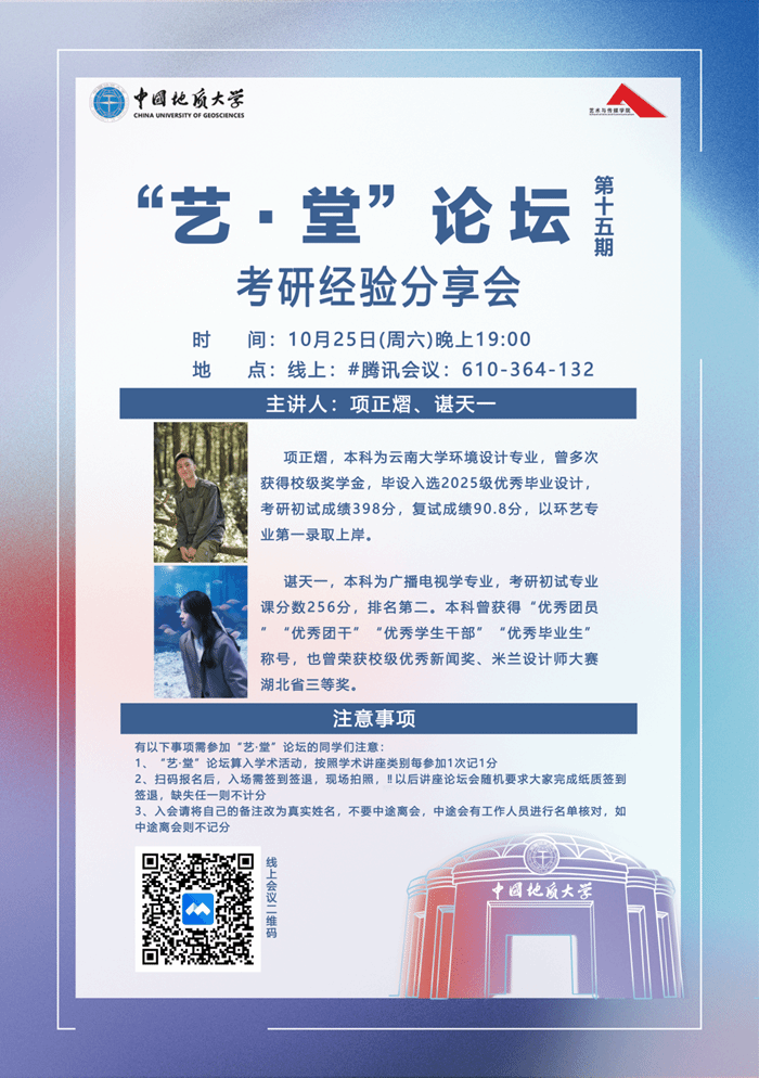 为帮助同学们明确考研方向、优化备考策略,10月25日晚上19:00,威廉williamhill“艺・堂”论坛第十五期(学风建设系列第八期)考研经验分享会在线上腾讯会议举行。本次分享会邀请环境设计专业考研高分上岸的项正熠与新闻传播学备考经验丰富的谌天一担任主讲人,为参会同学带来干货满满的考研指导,助力大家高效备战。