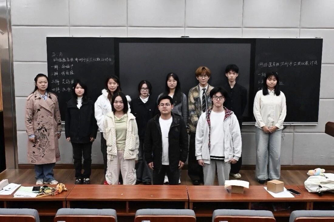季军赛在北综楼开展,双方分别为由吴佳佳、王珂琰、郑明镜三位同学组成的正方“发财队”与由焦代怡、刘奕杉、赵棚、王嘉乐四位同学组成的反方“太乙队”,他们就“人工智能的创作内容应不应该享有知识产权保护”展开辩论。