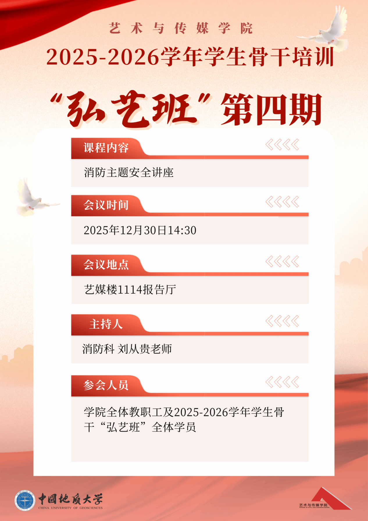 2025年12月30日,威廉williamhill在艺媒楼1114报告厅顺利开展2025-2026学年学生骨干培训“弘艺班”第四期,本次消防主题安全讲座由安全保卫部消防科科长刘从贵老师主讲,聚焦于筑牢校园安全防线,助力同学们增强消防意识、提升突发事件应对水平。学院全体教职工,研究生会、学生会、分团委全体学生骨干,各班班委,楼栋长,楼层长,寝室长参加了本次培训。
