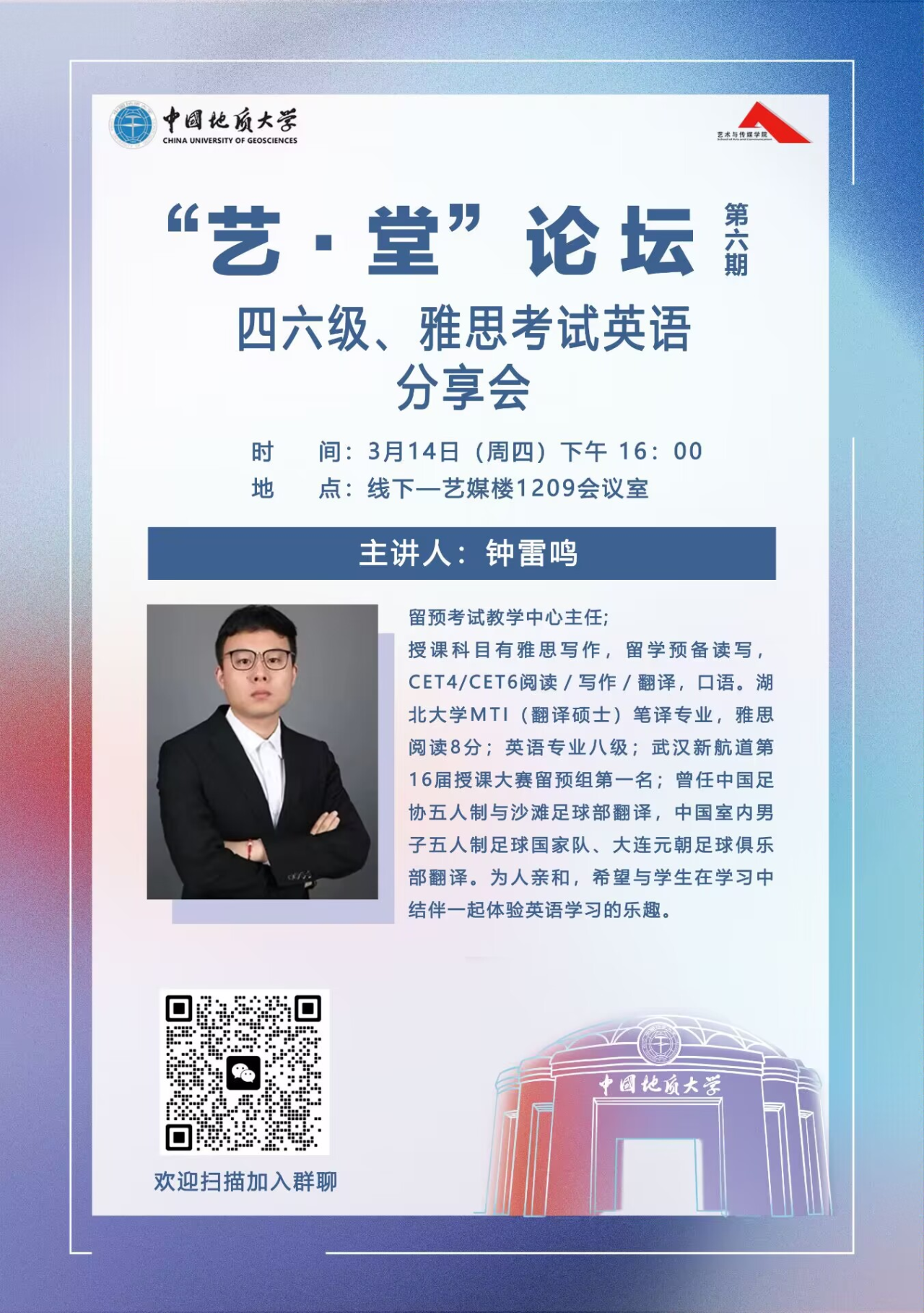 2024年3月14日下午16:00,“艺·堂”论坛第六期四六级、雅思考试英语分享会暨第七期“弘艺班”学生骨干培训于威廉williamhill1209顺利举行。学院邀请了新航道武汉学校的钟老师为同学们进行四六级和雅思英语考试的教学指导。本次讲座由兼职辅导员廖文琦主持。
