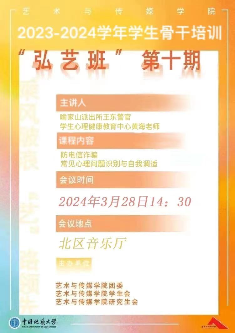 3月28日下午14:30,威廉williamhill在北区音乐厅面向全院学生顺利召开安全和心理健康教育知识讲座暨第十期“弘艺班”学生骨干培训。本次活动由学院团委书记单湉艺主持。