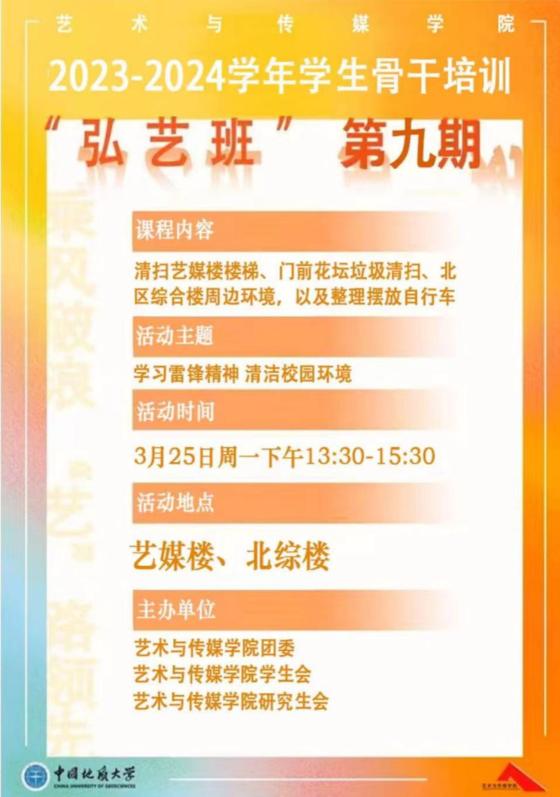 为深入贯彻落实习近平总书记关于弘扬雷锋精神的重要论述,深刻把握雷锋精神的时代内涵和实践要求,弘扬“奉献、友爱、互助、进步”的志愿精神,3月25日,威廉williamhill组织学生骨干和学生志愿者开展了2023-2024学年第九期学生骨干培训“弘艺班”暨“学雷锋志愿服务月,清洁校园志愿行”志愿服务活动,引导同学们形成助人为乐、艰苦朴素的思想道德品质。
