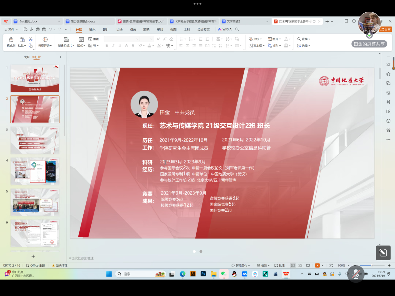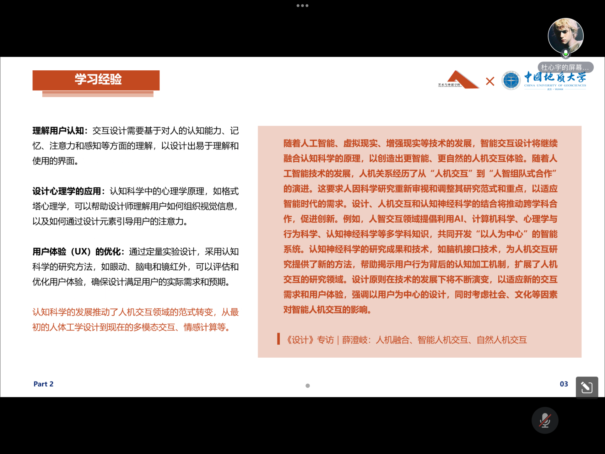 首先,2021级交互设计研究生田金同学从学术科研和个人综合实力两个方面为同学们分享,介绍了自己的学术科研经历,着重分享了参与实践项目与综合竞赛的经验。