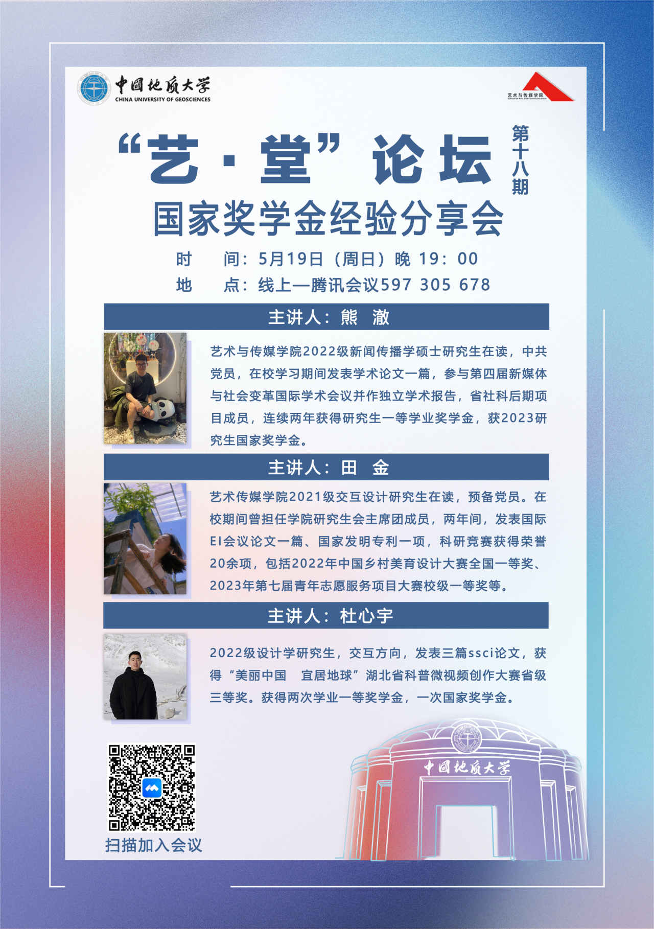 2024年5月19日晚上19:00,“艺·堂”论坛第十八期国家奖学金获得者经验分享会顺利举行。学院邀请了研究生熊澈、田金和杜心宇为同学们进行经验分享。本次讲座由兼职辅导员廖文琦主持。