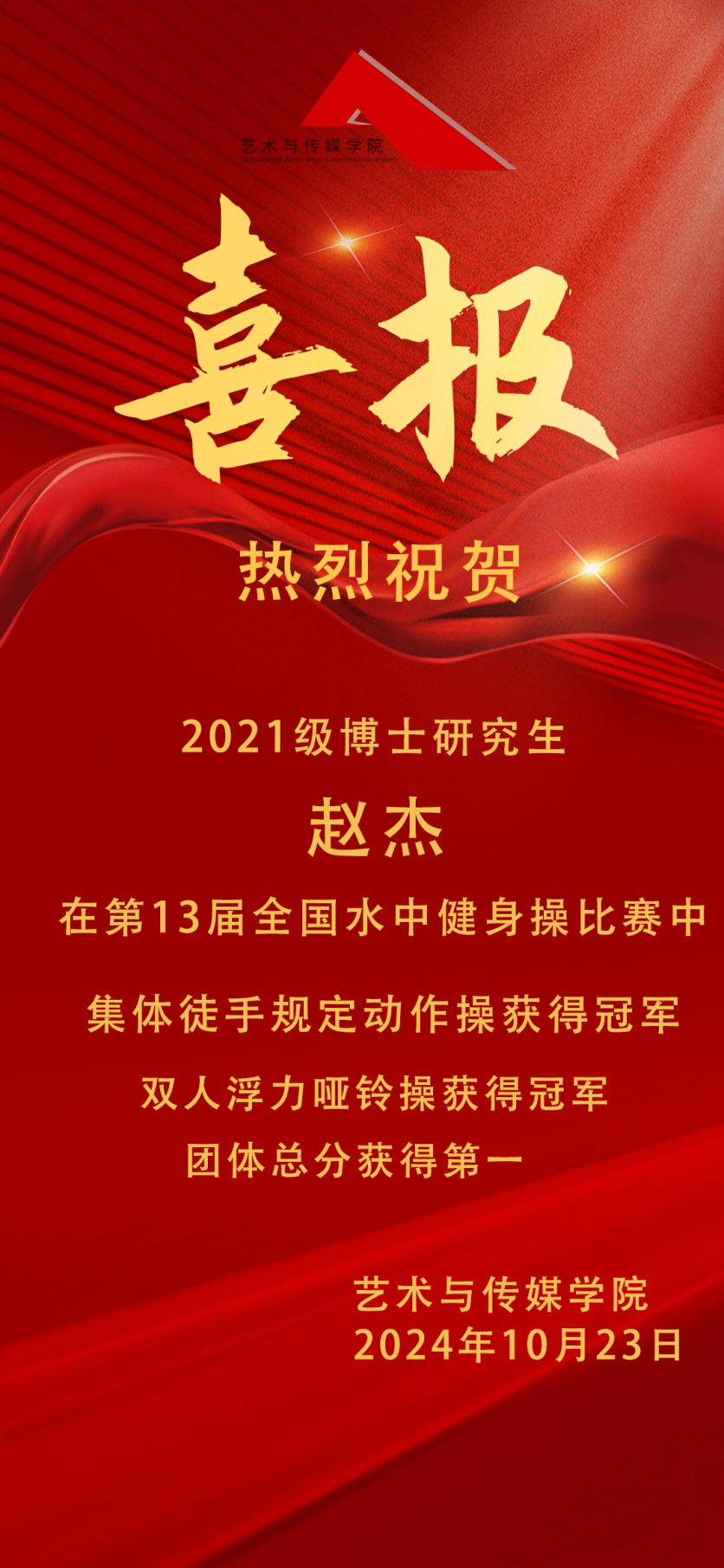2024年10月19日至20日,第13届全国水中健身操比赛在安徽省马鞍山市奥体中心游泳馆举行。在此次水中健身操比赛中,william威廉中文代表队共13人参赛,并斩获佳绩。我院21级博士研究生赵杰获得集体徒手规定动作操冠军、双人浮力哑铃操冠军以及团体总分第一的优异成绩。