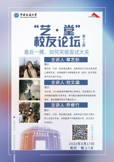 2022年3月17日晚7点,威廉williamhill第十七期“艺·堂”校友论坛以腾讯会议的方式在线上开展。主题为“最后一搏,如何突破面试大关”,我院在读研究生章艺彤、刘文涵、乔修竹进行讲座分享。