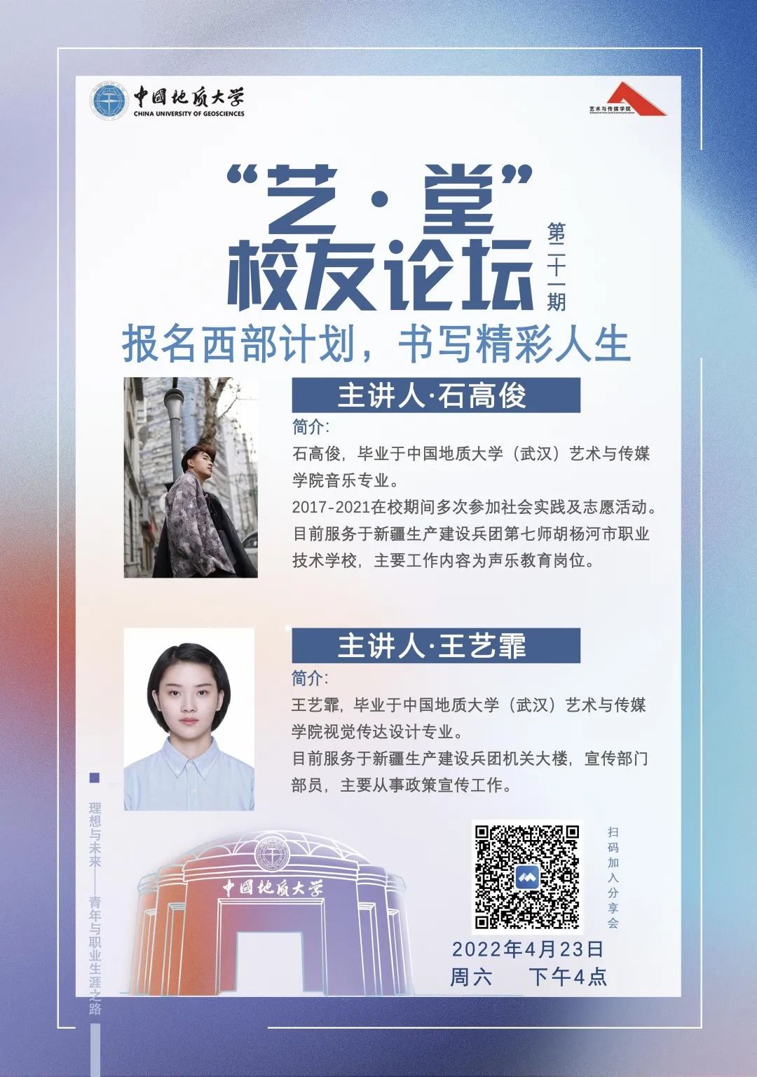 4月23日下午4:30,威廉williamhill第二十一期“艺·堂”校友论坛“报名西部计划,书写精彩人生”讲座活动顺利进行,由我院音乐专业毕业生石高俊和视觉传达设计专业毕业生王艺霏主讲。