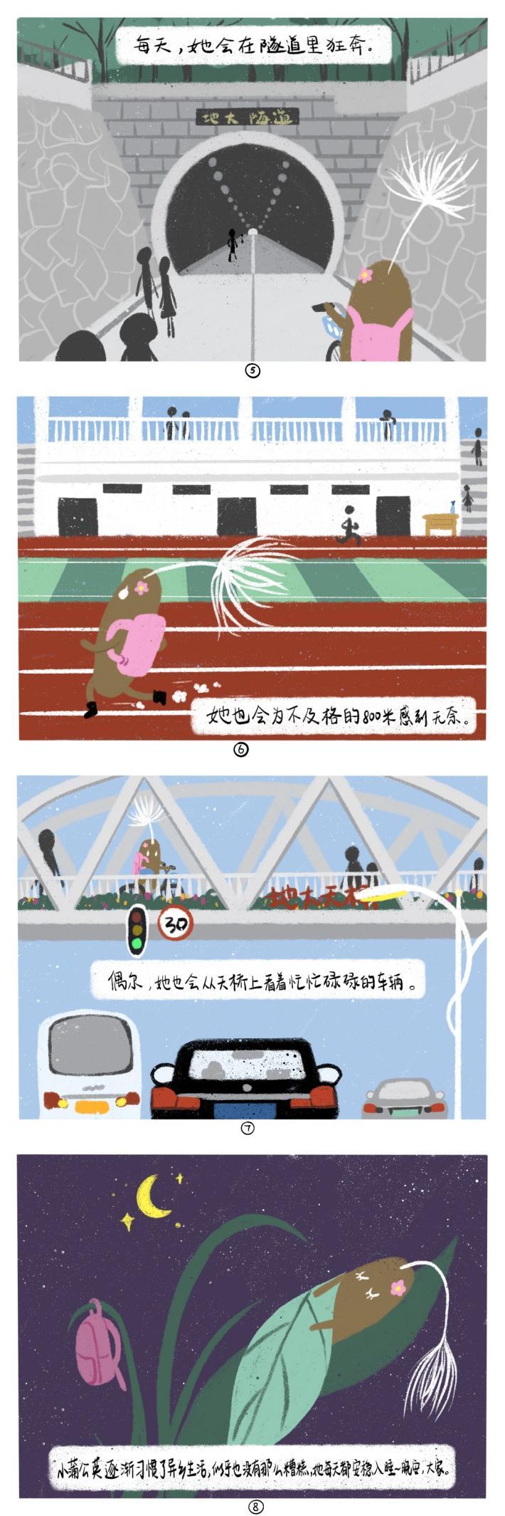 漫画中小小的蒲公英种子随着风离开了家,正如同作者离开家人的庇护,独自来到学校。在这个全新的领域里,当然免不了迷茫和害怕,但是最终这颗种子在这里扎根安家,作者也安定下来,享受着平凡而自在的生活。渺小而平凡的我们也要像这颗小小的种子一般,积极应对改变,要相信,一切都会好起来的!