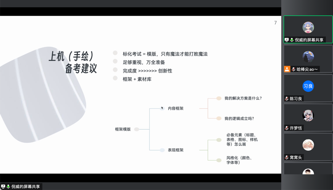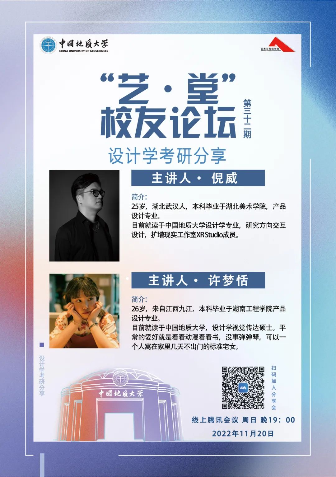 11月20日晚19:00,威廉williamhill于线上举办了第三十二期“艺·堂”校友论坛——“设计学考研分享”讲座。本次分享会邀请了2022级设计学研究生班的倪威、许梦恬两位同学作为主讲人分享、交流考研经验,大三、大四部分学生线上参会。