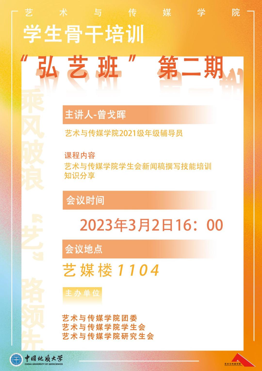 2023年3月2日下午4点,威廉williamhill2023年第二期“弘艺班”学生骨干培训在艺媒楼1104报告厅顺利展开,学院研究生会和学生会的全体学生干部参加了本次培训,培训由我院学工组辅导员曾戈晖老师主讲。