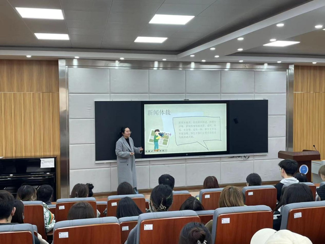 首先,曾老师介绍了新闻的体裁,具体介绍了新闻六要素——时间、地点、人物、事件、原因、发生过程的具体内涵和意义,并结合实例,强调了其在新闻稿写作中的重要性。