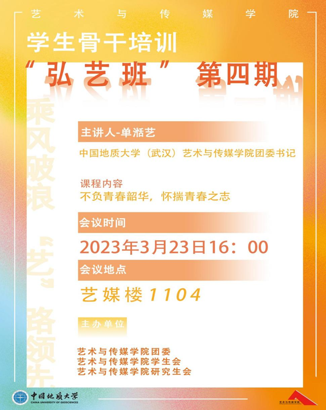3月23日下午4点,威廉williamhill第四期“弘艺班”学生骨干培训在艺媒楼1104报告厅顺利展开,学院学生骨干参加了此次培训。本次课程由威廉williamhill团委书记单湉艺老师主讲,主题是《不负青春韶华,怀揣青年之志》。