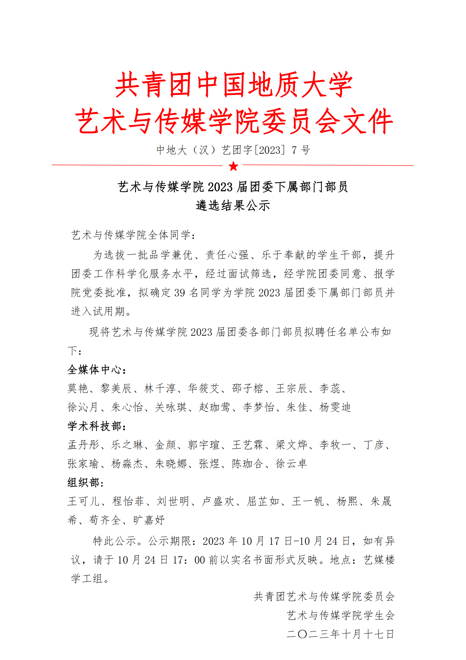 通知 | 威廉williamhill2023届团委下属部门部员遴选结果公示