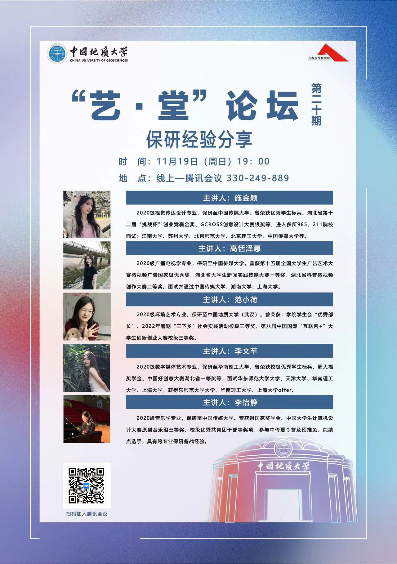 2023年11月19日晚上19:00,“艺·堂”论坛第二十期保研经验分享会于线上腾讯会议平台顺利举行。学院邀请了五位保研上岸的不同专业的同学,分别广播电视学保研到中国传媒大学的高恬泽惠同学、视觉传达设计学保研到中国传媒大学的施金颖同学、数字媒体艺术学保研到华南理工大学的李文芊同学、环境艺术学专业保研到william威廉中文的范小荷同学,和音乐学保研到中国传媒大学的李怡静同学进行保研经验分享。本次讲座由兼职辅导员徐雯茜主持。