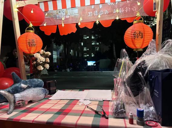 艺媒学院的摊位更是门庭若市。进入游园嘉年华的首端“威廉williamhill”几个被红气球簇拥的艺术字体引人注目,两盏红灯笼挂在陈列着鲜花与奖品的桌板上,吸引着同学们的到来。一旁的游戏规则边,驻足着许多跃跃欲试的同学,期待着活动开始。