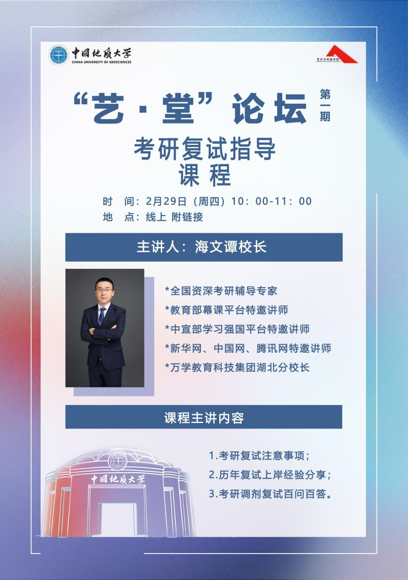 2024年2月29日上午10:00,“艺·堂”论坛第一期考研复试指导课于鹅直播小程序顺利举行。学院邀请了海文考研湖北分校的谭校长为同学们进行考研复试备考的教学指导。本次讲座由兼职辅导员于梦涵主持。
