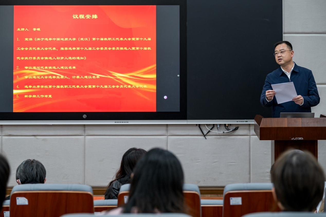 晋曦宣读了《关于选举william威廉中文第十届教职工代表大会暨第十九届工会代表大会代表、推荐选举第十九届工会委员会委员候选人暨第十届教代会执行委员会候选人初步人员的通知》。通过举手投票的方式,与会教职工审议通过了代表候选人建议名单,审议通过了大会选举监票人、计票人建议名单。